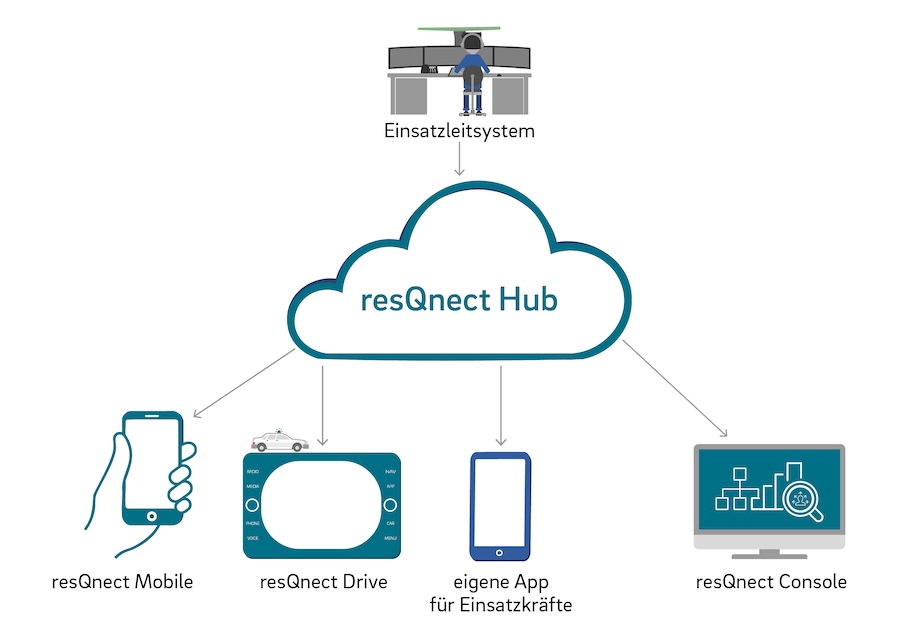 resQnect Hub bildet die Basis der Plattform, um Informationen zwischen Einsatzleitstellen und Einsatzkräften auszutauschen. Mit den mobilen Apps von resQnect für Android und iOS können alle einsatzrelevanten Informationen in kürzester Zeit an die beteiligten Einsatzkräfte übermittelt werden. Gleichzeitig bieten sie Hilfestellungen im Einsatz und reduzieren den Bedarf zur Sprachkommunikation mit der Einsatzleitstelle. Durch die Gestaltung als offene Kommunikationsplattform ist es möglich, eigene Apps oder eigene Einsatzleitsysteme an die Plattform anzubinden.